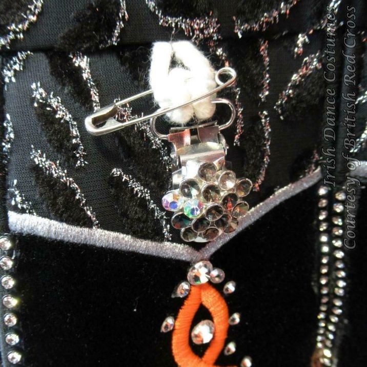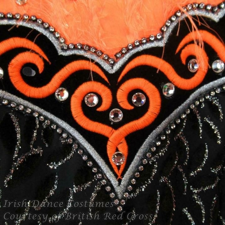 A similar style of embroidered pattern goes across the whole hem of the back skirt, and a reduced similar version along the front and back top bodice dividing the black and orange fabric of the dress. That section of the pattern is also lined with silver machine embroidery both above and below. In addition, that front part is lined with rhinestones.